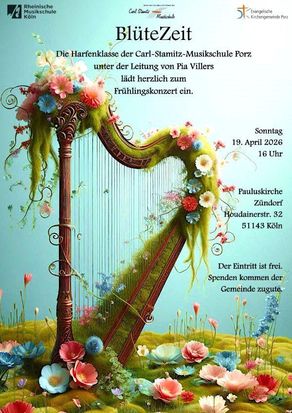 Die Harfenklasse der Carl-Stamitz-Musikschule Porz unter der Leitung von Pia Villers lädt herzlich zum Frühlingskonzert ein.
