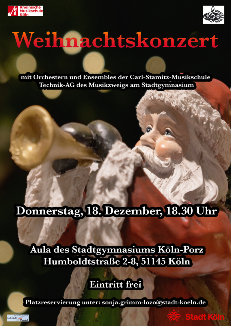 Es musizieren die Porzer Stadtmusikanten mit den Carl-Stamitz-Streichorchestern, das Harfenensemble „SchokoladenSaiten“, das Flötenensemble „Flautín“, Kammermusik mit Blockflöten und Klavier, ein Quartett mit Sologesang und Streich-Trio sowie das „Cologne Ukulele Orchestra“.
